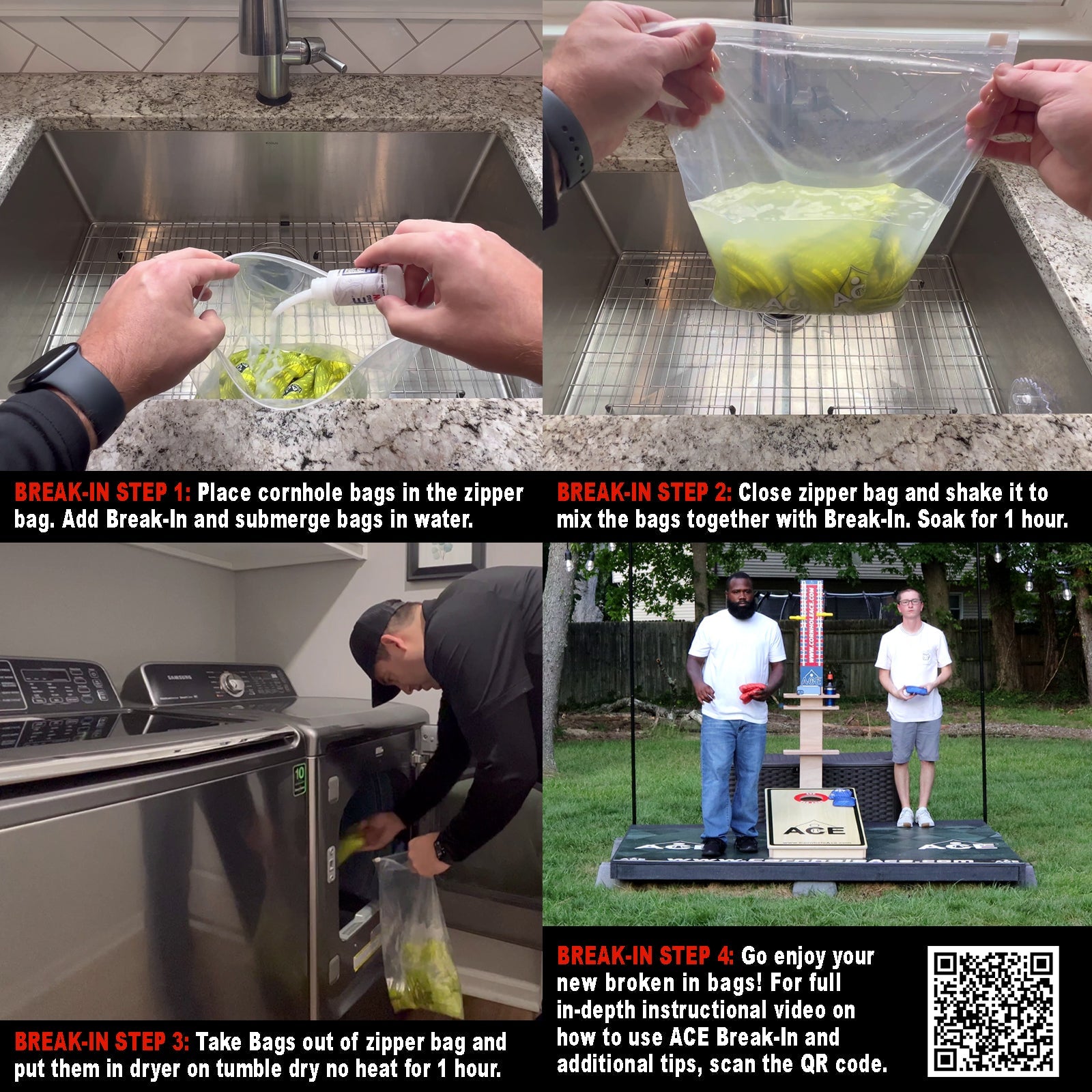 • BREAK IN CORNHOLE BAGS FAST! The ACE Cornhole Bag Break-In Kit was designed specifically to break in new cornhole bags fast. Place 4 cornhole bags into the zipper bag. Fill the bag with the Break-In formula and submerge the cornhole bags with water. Let sit for an hour. Remove the bags from the water and rinse. Place in the dryer for 60-90 minutes and the bags are broken in.